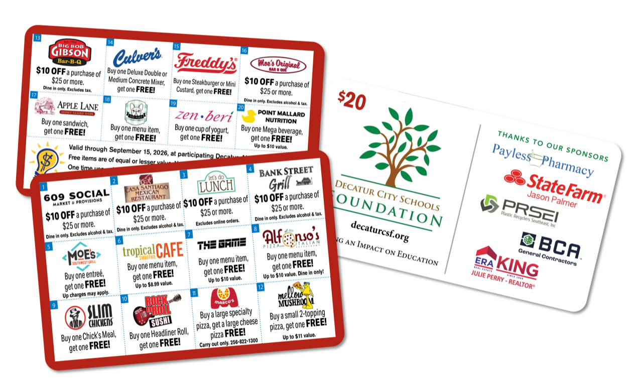 This wallet-sized card boasts 20 money saving deals (+ double the deals on the FREE app). BOGO’s include Rock-n-Roll Sushi, The Brick Deli, Moe’s BBQ, Zen-Beri, UpSurge, 609 Social Market & Provisions and more! Purchase from any DCS student family or at www.citysaver.com/decatur . Valid through September 15, 2026.